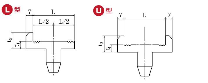 - 架台受けL型、U型は機械架台(上架台)と下架台の形鋼の種類やサイズにより適宜組合わせて使用します。