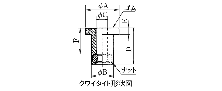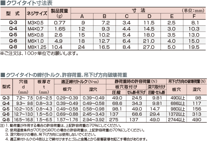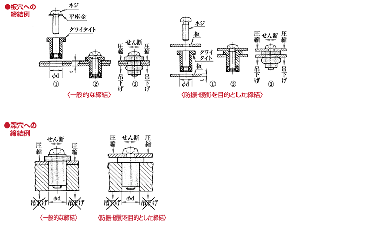 - 締結方法には、単に固定するための締結と防振緩衝を主目的とする締結方法とがありますが、いずれの方法も一方向からクワイタイトを貫通穴(金属、コンクリート、合成樹脂、ガラス、木材などの板穴、深穴)に挿入し、ネジにてねじ込むだけで、ゴムスリーブがふくらみ、迅速に締結を終了しますので、角、丸パイプなどのように手の届かない狭い場所にも容易に取付けられます。